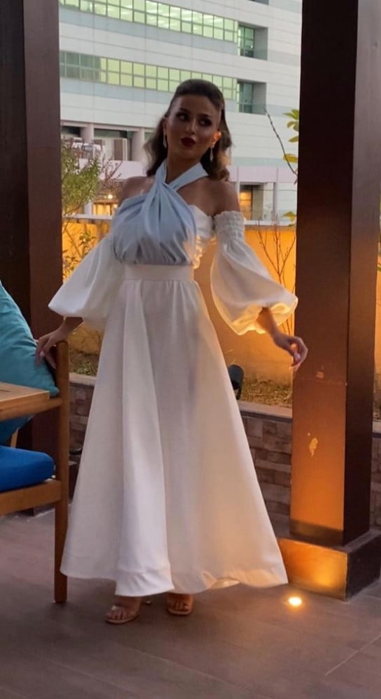 - كما أن تصميم الفستان يأتي بفتحة من عندّ الصدر والظهر لتناسب غير المحجبات.