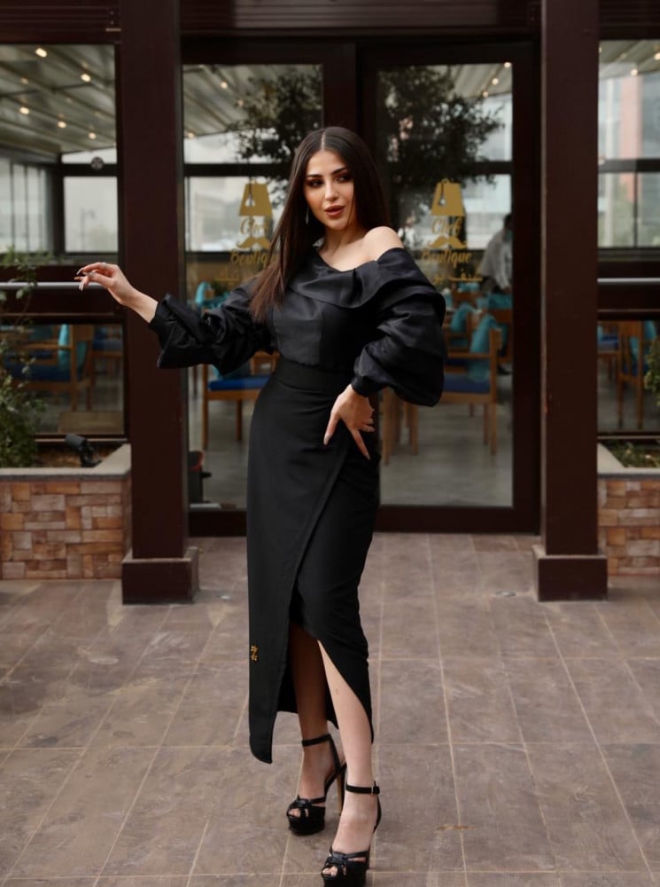 - يأتي الفستان بكتف واحد عاري، وأكتاف واسعة طويلة مذمومة عند المعصم بمظهرٍ جمالي فريد.