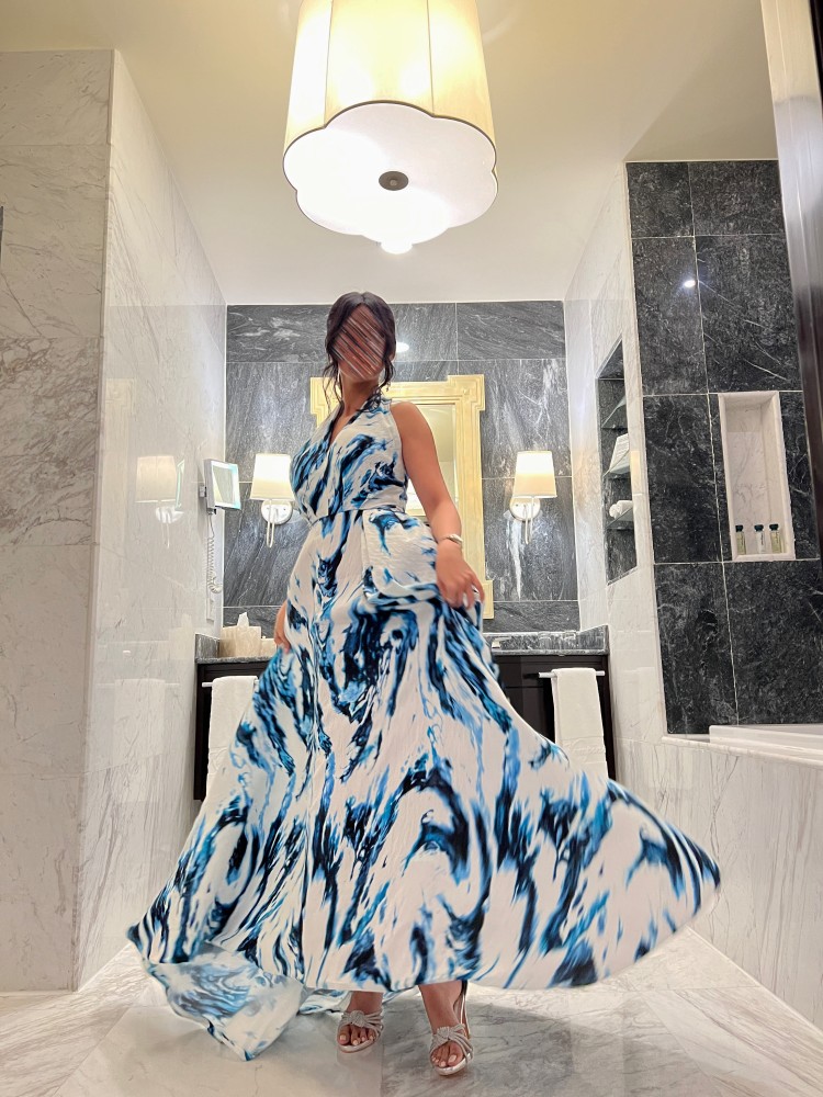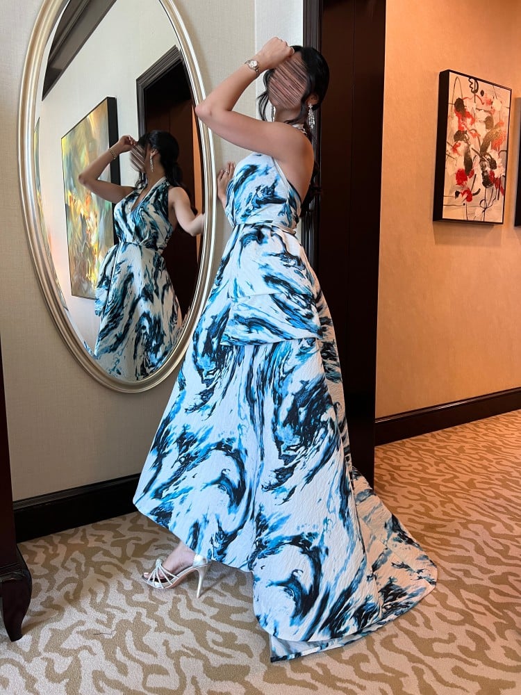 - يأتي الجزء العلوي مُمسكًا على منطقة الصدر قليلًا، ويمتد القماش على الرقبة لإظهار منطقة الظهر، بينما يأتي الجزء السفلي فضفاضًا.