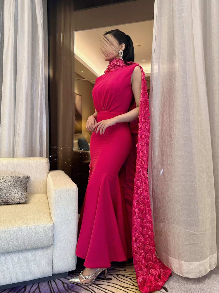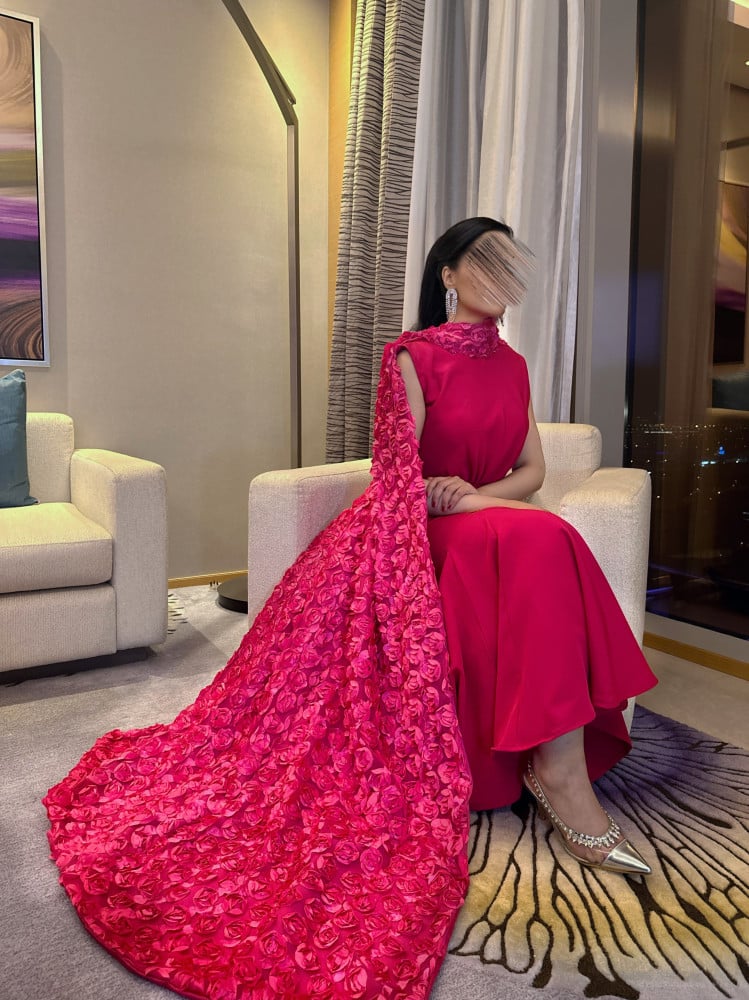 A very elegant evening pink dress that embodies femininity and sophistication, thanks to its unique design, especially with its back jacket worn from the neckline made of rose-patterned fabric, adding a wonderful elegance.