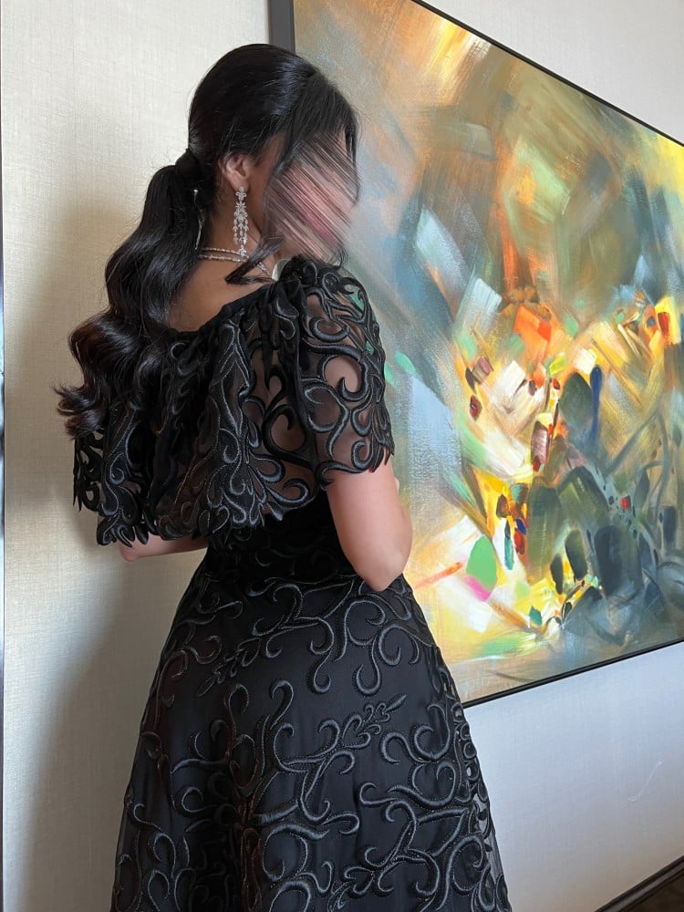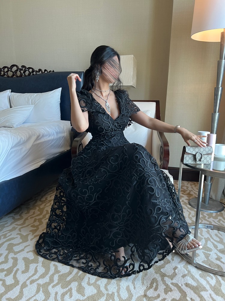 A highly elegant black evening dress crafted from professionally embroidered lace, providing sophistication and a classy, luxurious appearance. It features a simple neckline design, adding to its elegance and classic charm.