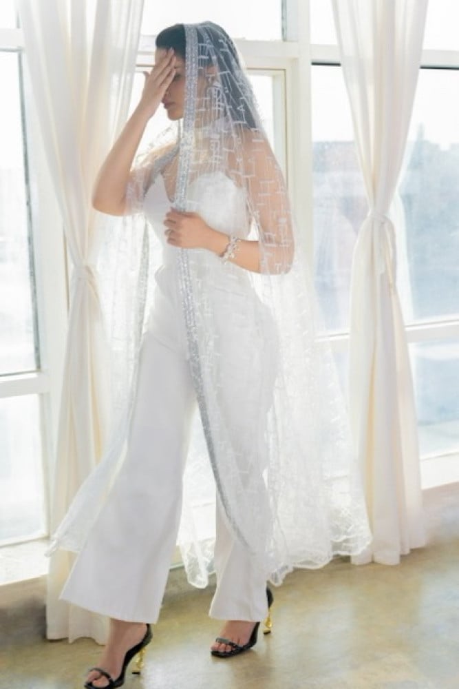 A women's jumpsuit distinguished by its elegant and modern design, blending soft, flowing lines with the sophistication of white color. Additionally, it comes with a lovely lace shawl, allowing you to create numerous stylish looks. Featuring an open back and front, it exudes extreme elegance and femininity, making it suitable for a variety of different outfits.