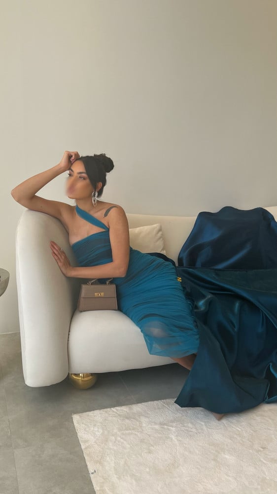 A Turquoise evening dress featuring a design that combines elegance and femininity, with a slit from the knee downward. It also includes subtle openings at the back and neckline, along with a long train that gives the dress a luxurious royal appearance. Therefore, it is considered an elegant and luxurious dress suitable for all occasions.